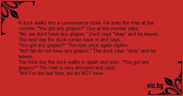 "No! We do not have any grapes." The duck says "okay" and he leaves.