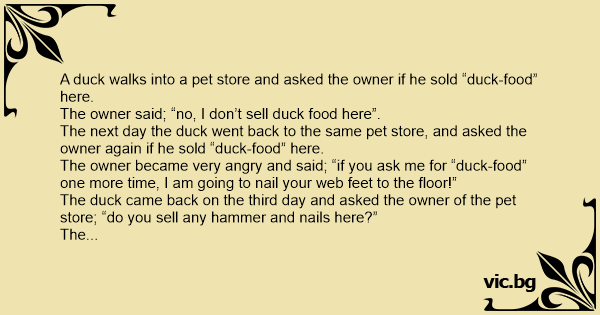 The next day the duck went back to the same pet store, and asked the owner again if he sold “duck-food” here.