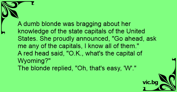 A dumb blonde was bragging about her knowledge of the state capitals of the United States. She proudly announced, "Go ahead, ask me any of the capitals, I know all of them."