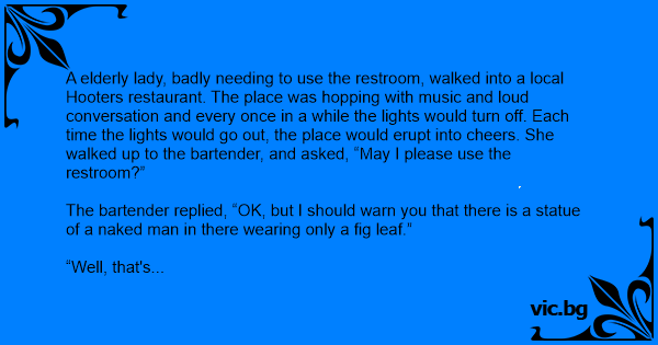 A elderly lady, badly needing to use the restroom, walked into a local Ноотеrs restaurant. The place was hopping with music and loud conversation and every once in a while the lights would turn off. Each time the lights would go out, the place would erupt into cheers. She walked up to the bartender, and asked, “May I please use the restroom?”