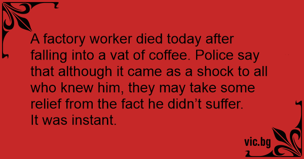 A factory worker died today after falling into a vat of coffee. Police say that although it came as a shock to all who knew him, they may take some relief from the fact he didn’t suffer.