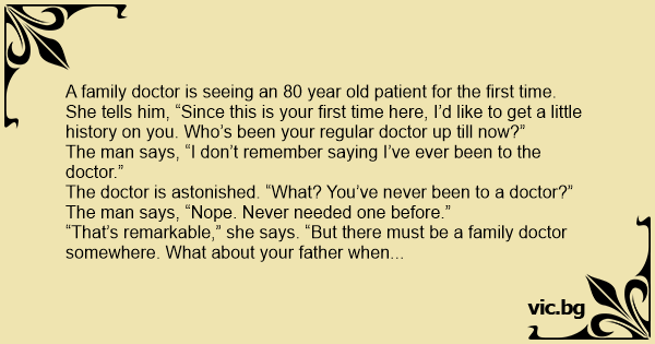 A family doctor is seeing an 80 year old patient for the first time. She tells him, “Since this is your first time here, I’d like to get a little history on you. Who’s been your regular doctor up till now?”