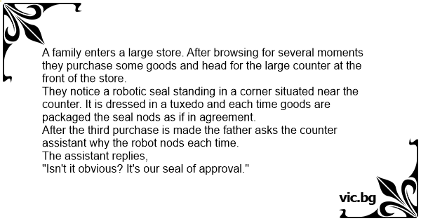 They notice a robotic seal standing in a corner situated near the counter. It is dressed in a tuxedo and each time goods are packaged the seal nods as if in agreement.