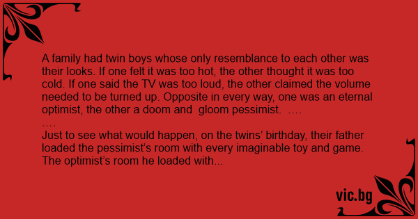 A family had twin boys whose only resemblance to each other was their looks. If one felt it was too hot, the other thought it was too cold. If one said the TV was too loud, the other claimed the volume needed to be turned up. Opposite in every way, one was an eternal optimist, the other a doom and gloom pessimist. ….