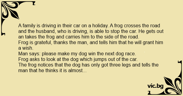 The frog notices that the dog has only got three legs and tells the man that he thinks it is almost impossible to fulfill his wish and asks that the man will tell him another wish.