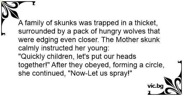 A family of skunks was trapped in a thicket, surrounded by a pack of hungry wolves that were edging even closer. The Mother skunk calmly instructed her young: