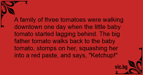A family of three tomatoes were walking downtown one day when the little baby tomato started lagging behind. The big father tomato walks back to the baby tomato, stomps on her, squashing her into a red paste, and says, "Ketchup!"