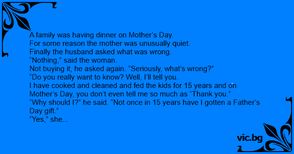 A family was having dinner on Mother’s Day. For some reason the mother was unusually quiet. Finally the husband asked what was wrong. “Nothing,” said the woman. Not buying it, he asked again. “Seriously, what’s wrong?” “Do you really want to know? Well, I’ll tell you. I have cooked and cleaned and fed the kids for 15 years and on Mother’s Day, you don’t even tell me so much as “Thank you.” “Why should I?” he said. “Not once in 15 years have I gotten a Father’s Day gift.” “Yes,” she said, “but I’m their real mother.”