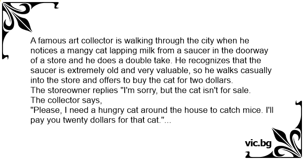 A famous art collector is walking through the city when he notices a mangy cat lapping milk from a saucer in the doorway of a store and he does a double take. He recognizes that the saucer is extremely old and very valuable, so he walks casually into the store and offers to buy the cat for two dollars.