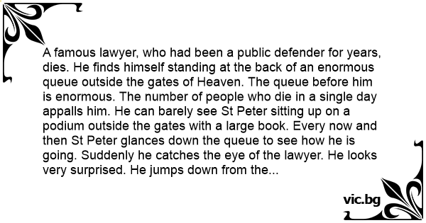 A famous lawyer, who had been a public defender for years, dies. He finds himself standing at the back of an enormous queue outside the gates of Heaven. The queue before him is enormous. The number of people who die in a single day appalls him. He can barely see St Peter sitting up on a podium outside the gates with a large book. Every now and then St Peter glances down the queue to see how he is going. Suddenly he catches the eye of the lawyer. He looks very surprised. He jumps down from the podium and comes running along the line until slightly out of breath he arrives beside the lawyer. He embraces him. He pulls him out of the queue and motions for him to come to the front of the queue. Another person questions what is happening and another angel speaks to the person. Word is passed along the queue and the lawyer is surprised, as people start nodding and clapping. He becomes embarrassed by all the attention and asks St Peter why he is getting the special attention.