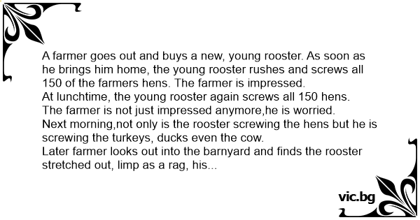 A farmer goes out and buys a new, young rooster. As soon as he brings him home, the young rooster rushes and screws all 150 of the farmers hens. The farmer is impressed.