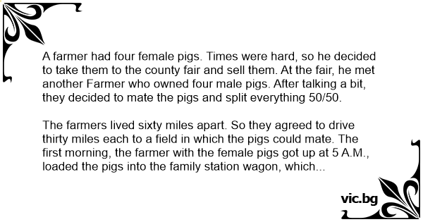 The farmers lived sixty miles apart. So they agreed to drive thirty miles each to a field in which the pigs could mate. The first morning, the farmer with the female pigs got up at 5 A.M., loaded the pigs into the family station wagon, which was the only vehicle he had, and drove the thirty miles.