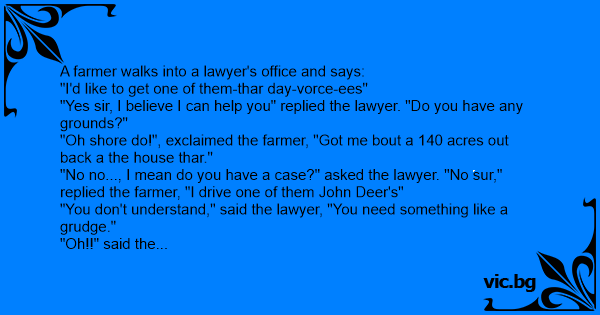 "Oh!!" said the farmer, "I got me one of those! That's what I park muh Deer in!" The lawyer, a bit frustrated responded, "Sir, you've got to have a reason to divorce your wife. Does she beat you up or anything?"