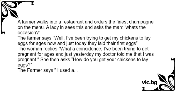 The farmer says “Well, I’ve been trying to get my chickens to lay eggs for ages now and just today they laid their first eggs”