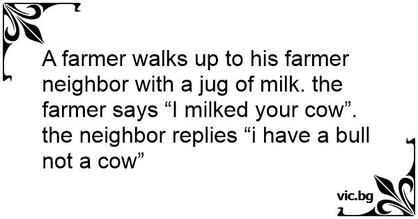 A farmer walks up to his farmer neighbor with a jug of milk. the farmer says “I milked your соw”. the neighbor replies “i have a bull not a соw”