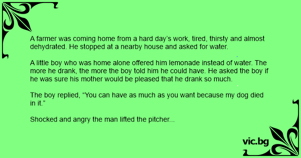 A farmer was coming home from a hard day’s work, tired, thirsty and almost dehydrated. He stopped at a nearby house and asked for water.