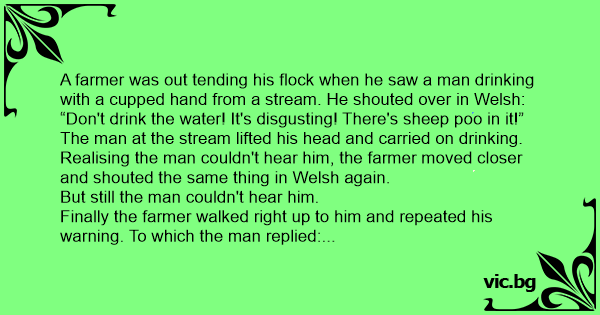 A farmer was out tending his flock when he saw a man drinking with a cupped hand from a stream. He shouted over in Welsh: “Don't drink the water! It's disgusting! There's sheep poo in it!”