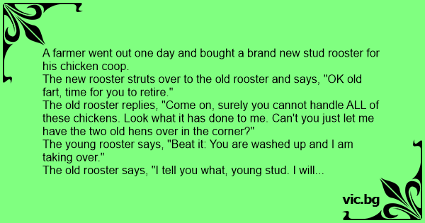 A farmer went out one day and bought a brand new stud rooster for his chicken coop.