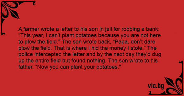 “This year, I can’t plant potatoes because you are not here to plow the field." The son wrote back, “Papa, don’t dare plow the field. That is where I hid the money I stole.” The police intercepted the letter and by the next day they'd dug up the entire field but found nothing. The son wrote to his father, “Now you can plant your potatoes."