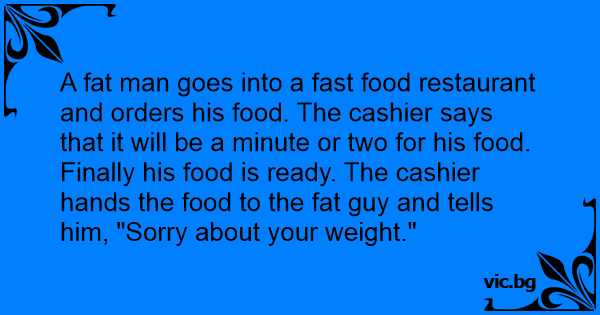 A fат man goes into a fast food restaurant and orders his food. The cashier says that it will be a minute or two for his food. Finally his food is ready. The cashier hands the food to the fат guy and tells him, "Sorry about your weight."