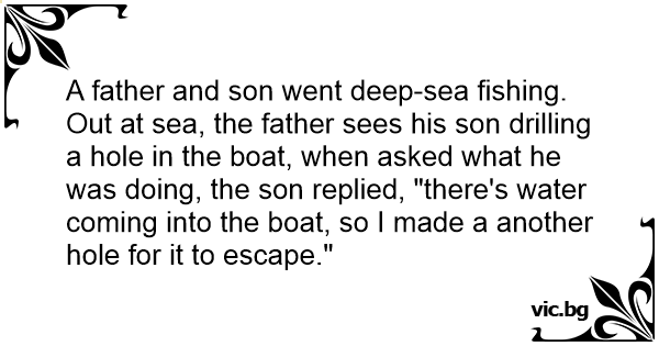 A father and son went deep-sea fishing. Out at sea, the father sees his son drilling a hole in the boat, when asked what he was doing, the son replied, "there's water coming into the boat, so I made a another hole for it to escape."
