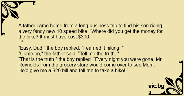 A father came home from a long business trip to find his son riding a very fancy new 10 speed bike. “Where did you get the money for the bike? It must have cost $300.