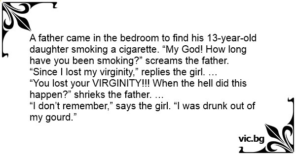 A father came in the bedroom to find his 13-year-old daughter smoking a cigarette. “My God! How long have you been smoking?” screams the father.