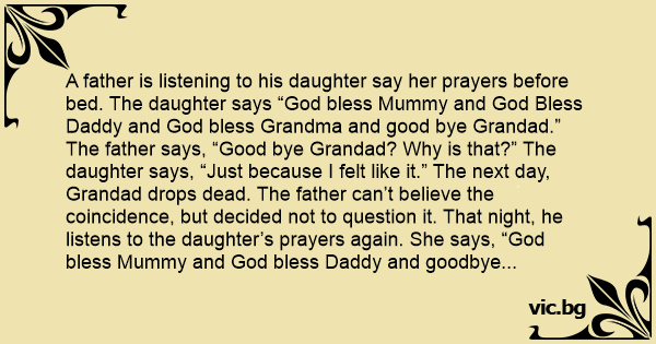 A father is listening to his daughter say her prayers before bed. The daughter says “God bless Mummy and God Bless Daddy and God bless Grandma and good bye Grandad.” The father says, “Good bye Grandad? Why is that?” The daughter says, “Just because I felt like it.” The next day, Grandad drops dead. The father can’t believe the coincidence, but decided not to question it. That night, he listens to the daughter’s prayers again. She says, “God bless Mummy and God bless Daddy and goodbye Grandma.” The father is shocked again and asks his daughter why, but she says again, “Just because I felt like it.” The next day, the Grandma drops dead and now the Father is getting worried but doesn’t know what to do, so he tries to forget about it. That night, he listens to his daughter again and she says, “God bless Mummy and goodbye Daddy.” The father is now terrified and goes to work the next day sweating, cancels all of his meetings, and hides in his office for the whole day. He doesn’t go home and stays there until midnight. He’s very surprised. ‘I’ve cheated death!’ he thinks to himself, then rushes home. His wife asks, “Where have you been?!” and the husband says, “Oh don’t ask me any questions, today’s been miserable.” The wife replies, “Your days been miserable? Well, listen to my day! Firstly, the milk man drops dead on the porch…”