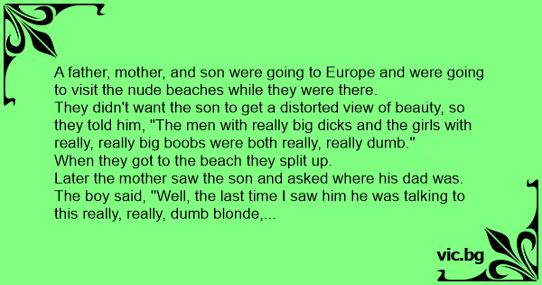 Едно семейство отива на нудистки плаж. По едно време идва детето и пита майка си: - Мамо, какви са жените с големи гърди? - Те са прости, моето момче! - А жените с малки гърди? - Те са умни! Момчето задоволено от отговорите отишло да си играе. След малко пак пристига: - Мамо, какви са мъжете с...