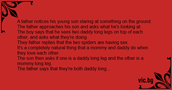 A father notices his young son staring at something on the ground. The father approaches his son and asks what he's looking at. The boy says that he sees two daddy long legs on top of each other, and asks what they're doing. They father replies that the two spiders are having sеx. It's a completely natural thing that a mommy and daddy do when they love each other. The son then asks if one is a daddy long leg and the other is a mommy long leg. The father says that they're both daddy long legs. The son stomps on them, killing them. The father asks why he did that. The boy replies "I don't want any of that fаggот-аss shiт in my yard."