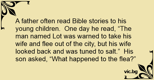 A father often read Bible stories to his young children. One day he read, “The man named Lot was warned to take his wife and flee out of the city, but his wife looked back and was tuned to salt.” His son asked, “What happened to the flea?”