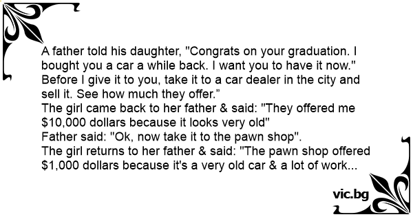 The girl returns to her father & said: "The раwn shop offered $1,000 dollars because it's a very old car & a lot of work done".