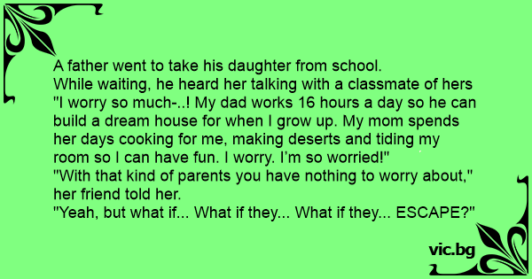 While waiting, he heard her talking with a classmate of hers "I worry so much-..! My dad works 16 hours a day so he can build a dream house for when I grow up. My mom spends her days cooking for me, making deserts and tiding my room so I can have fun. I worry. I’m so worried!"