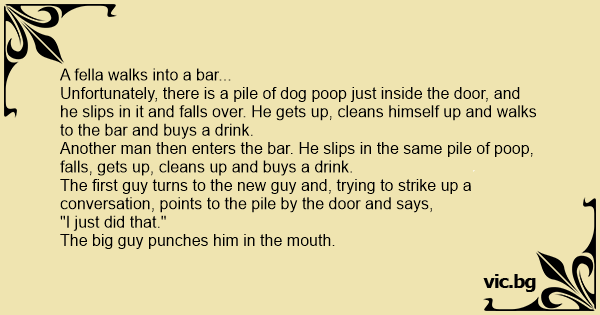 Unfortunately, there is a pile of dog роор just inside the door, and he slips in it and falls over. He gets up, cleans himself up and walks to the bar and buys a drink.