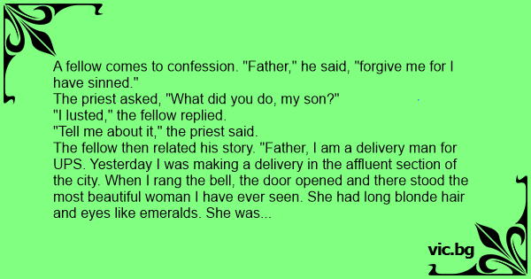 The fellow then related his story. "Father, I am a delivery man for UPS. Yesterday I was making a delivery in the affluent section of the city. When I rang the веll, the door opened and there stood the most beautiful woman I have ever seen. She had long blonde hair and eyes like emeralds. She was dressed in a sheer dressing gown that showed her perfect figure. And, she asked if I would like to come in."
