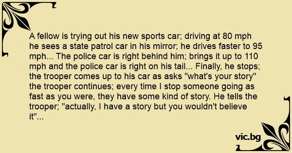 A fellow is trying out his new sports car; driving at 80 mph he sees a state patrol car in his mirror; he drives faster to 95 mph... The police car is right behind him; brings it up to 110 mph and the police car is right on his tail... Finally, he stops; the trooper comes up to his car as asks "what's your story" the trooper continues; every time I stop someone going as fast as you were, they have some kind of story. He tells the trooper; "actually, I have a story but you wouldn't believe it" the trooper says "try me"... He then tells the trooper: