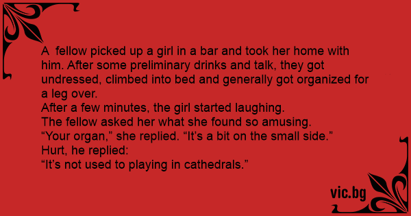 A fellow picked up a girl in a bar and took her home with him. After some preliminary drinks and talk, they got undressed, climbed into bed and generally got organized for a leg over.