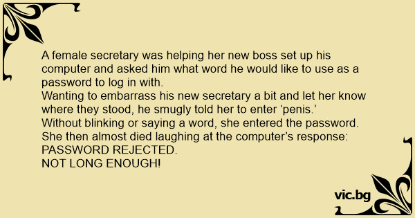 Ein Mann und eine Frau geben ein Passwort für ihren neuen Computer ein schreibt der Mann:,meinpenis " in die Spalte . seine Frau krümmt sich vor lachen den Bauch : im Computer steht zu kurz