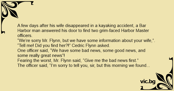 The officer said, “I’m sorry to tell you, sir, but this morning we found your wife’s body in the bay.”