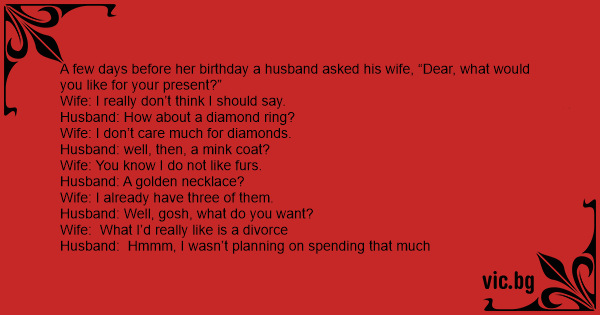 A few days before her birthday a husband asked his wife, “Dear, what would you like for your present?”