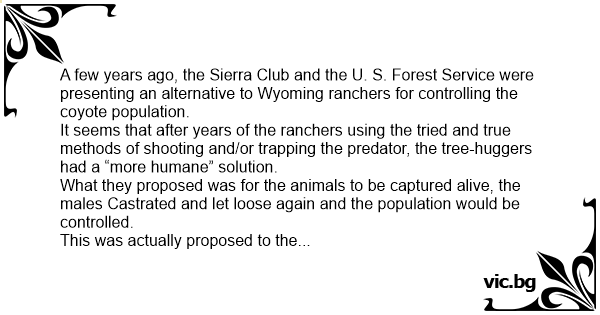 A few years ago, the Sierra Club and the U. S. Forest Service were presenting an alternative to Wyoming ranchers for controlling the coyote population.