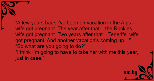 “A few years back I’ve been on vacation in the Alps – wife got pregnant. The year after that – the Rockies, wife got pregnant. Two years after that – Tenerife, wife got pregnant. And another vacation’s coming up…”