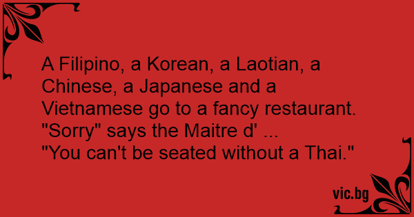A Filipino, a Korean, a Laotian, a Chinese, a Japanese and a Vietnamese go to a fancy restaurant. "Sorry" says the Maitre d' ...