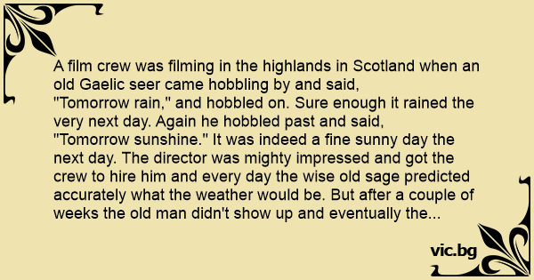 "Tomorrow sunshine." It was indeed a fine sunny day the next day. The director was mighty impressed and got the crew to hire him and every day the wise old sage predicted accurately what the weather would be. But after a couple of weeks the old man didn't show up and eventually the director found him in a bothy and said,