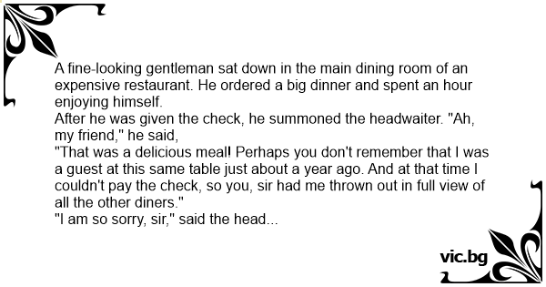 "That was a delicious meal! Perhaps you don't remember that I was a guest at this same table just about a year ago. And at that time I couldn't pay the check, so you, sir had me thrown out in full view of all the other diners."