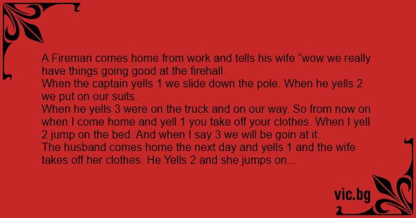 The husband comes home the next day and yells 1 and the wife takes off her clothes. He Yells 2 and she jumps on the bed. He then yells 3 and there going at it.