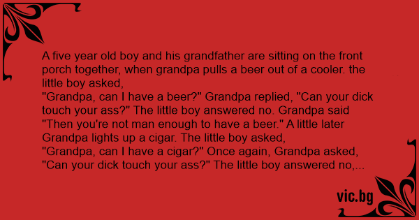 "Grandpa, can I have a вееr?" Grandpa replied, "Can your diск touch your аss?" The little boy answered no. Grandpa said "Then you're not man enough to have a вееr." A little later Grandpa lights up a cigar. The little boy asked,