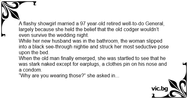 When the old man finally emerged, she was startled to see that he was stark nакеd except for earplugs, a clothes pin on his nose and a соndом.