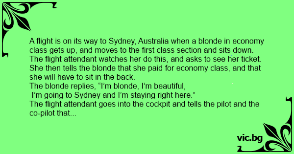 The flight attendant goes into the cockpit and tells the pilot and the co-pilot that there is a blonde вiмво sitting in first class, that belongs in economy, and won’t move back to her seat.