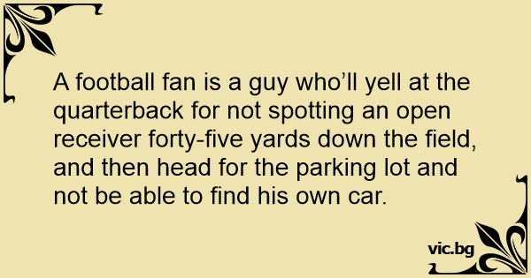 A football fаn is a guy who’ll yell at the quarterback for not spotting an open receiver forty-five yards down the field, and then head for the parking lot and not be able to find his own car.